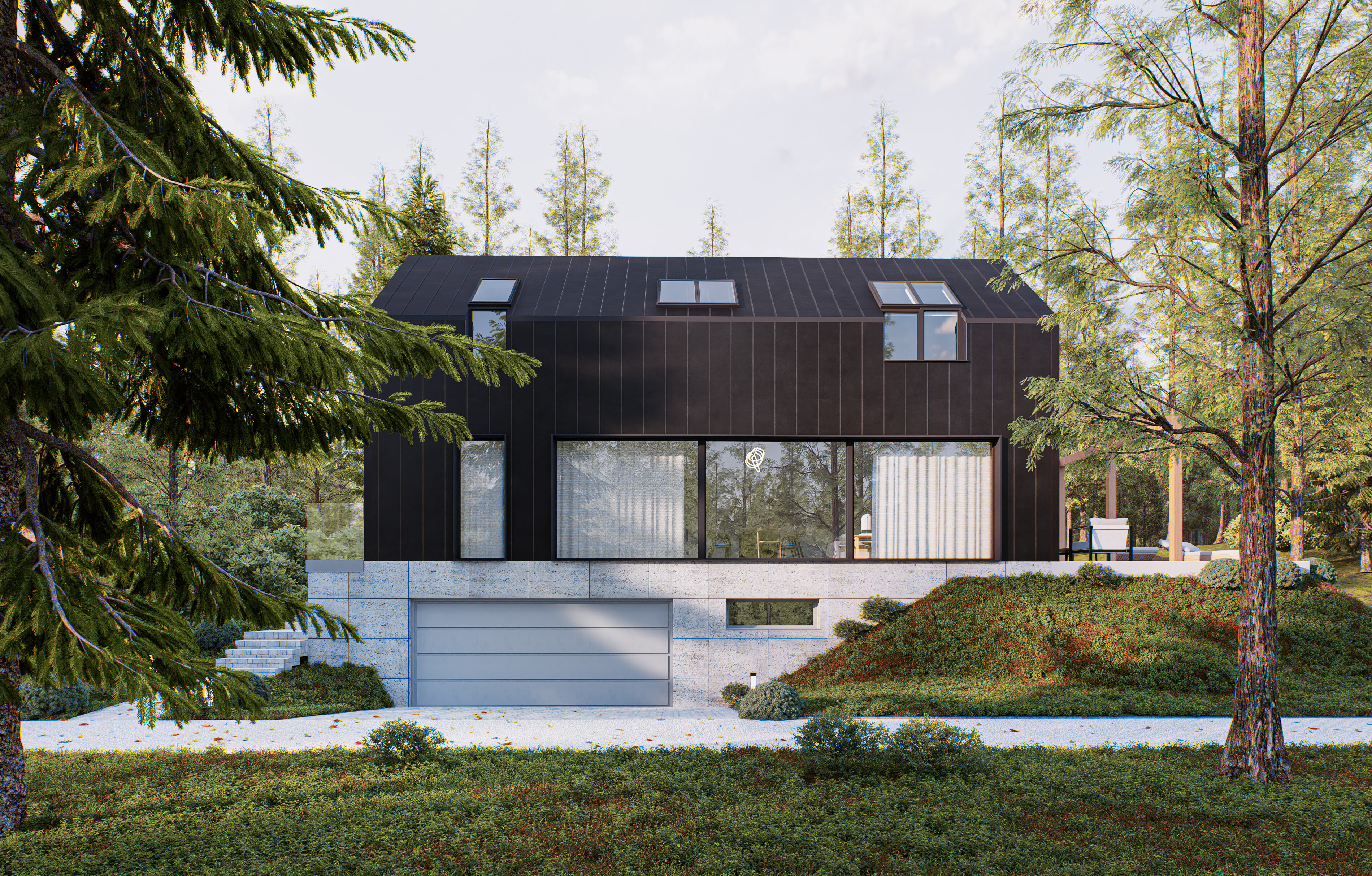 Bryła budynku jest prosta i nowoczesna, z elewacją wykończoną trwałymi i estetycznymi materiałami: blachą oraz opalaną, czarną deską.