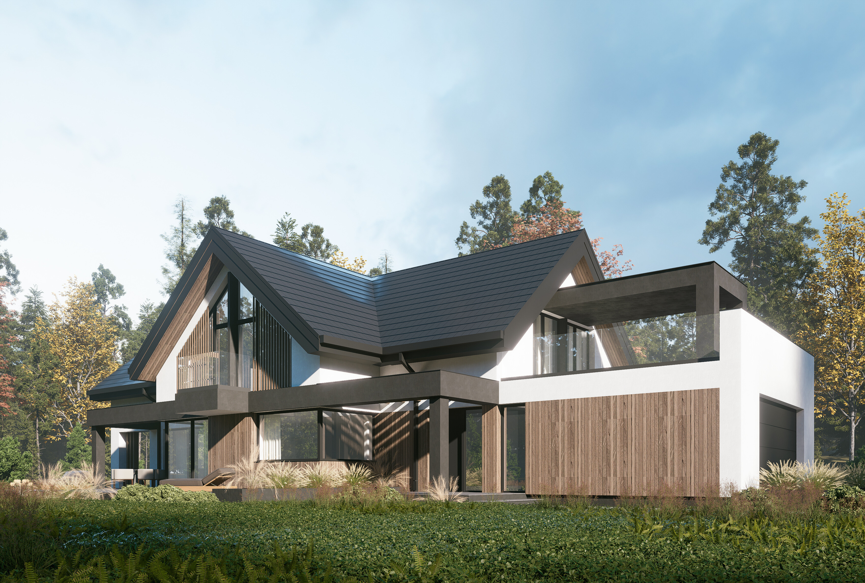 Elewacja nawiązuje do klasycznych rozwiązań, łącząc drewno z ciemnymi akcentami, co nadaje całości nowoczesny, ale stonowany charakter. Budynek zlokalizowany jest na dużej działce, w bezpośrednim sąsiedztwie lasu, co dodatkowo podkreśla jego relację z naturą.